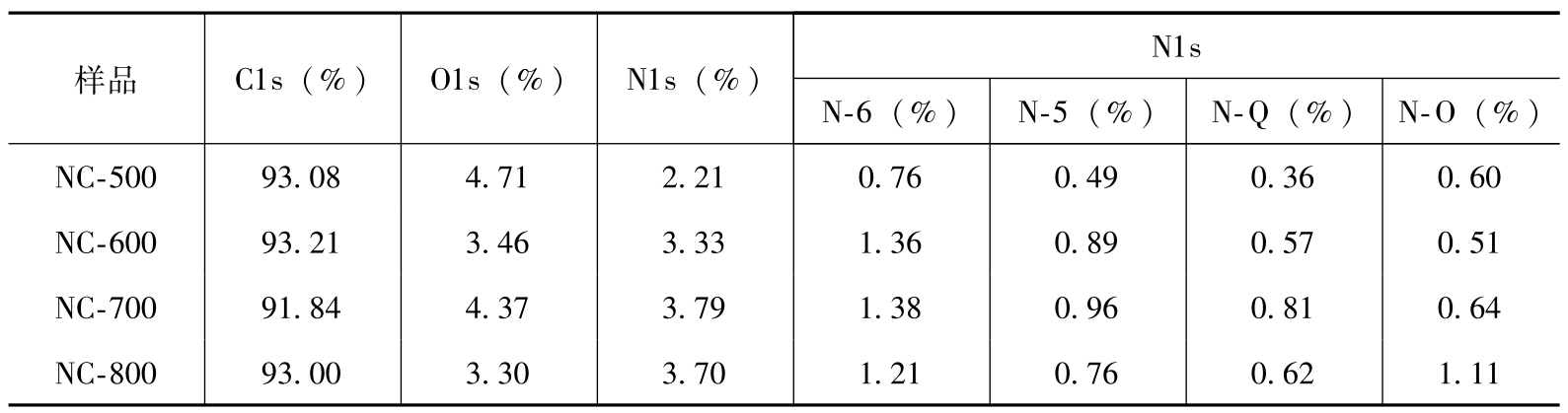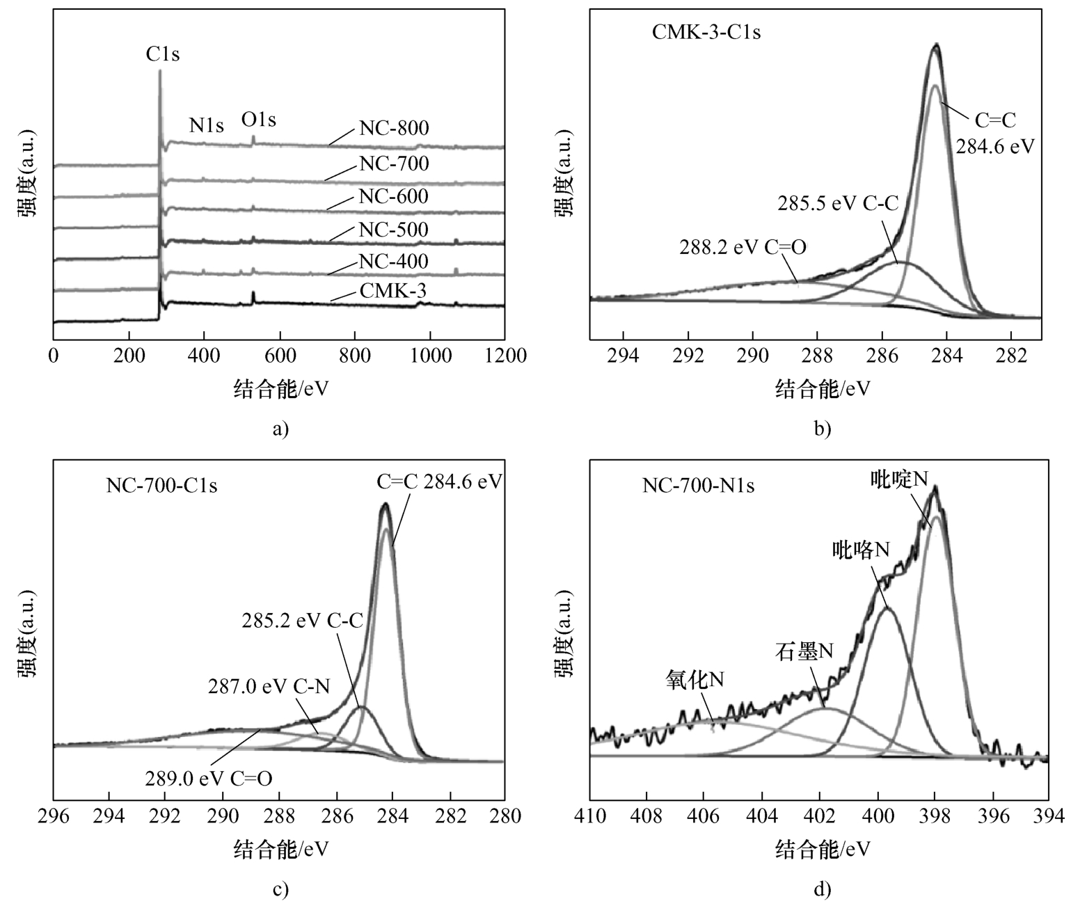 图3-20 a)CMK-3和NC-T的XPS全谱;b)CMK-3中C1s和c)NC-700中C1s的高分辨XPS图谱;d)NC-700中N1s的高分辨XPS图