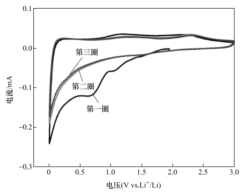 双碳型的对称锂离子电容器近年来也是科研工作者的研究热点,为了满足氮掺杂有序介孔碳的应用特性,将选取NC-700用于锂离子电容器的负极来组装对称的锂离子电容器器件,首先对其作为负极材料的性能进行测试。图3-24所示为在0.1mV/s的扫描速率下前三圈的测试结果,第一圈的放电曲线中大约在0.7V处存在一个明显的还原峰,这主要是因为氮掺杂有序介孔碳材料与电解液发生反应生成了固体电解质膜(SEI),会消耗一部分电解液并产生不可逆的容量损失。在0.01V处存在着尖锐的还原峰,这源于锂离子的嵌入反应,并且该峰在第二圈和第三圈都出现,说明这个过程是可逆的。第二圈和第三圈的曲线几乎重合,这表明含氮掺杂有序介孔碳材料NC-700拥有良好的电化学稳定性。