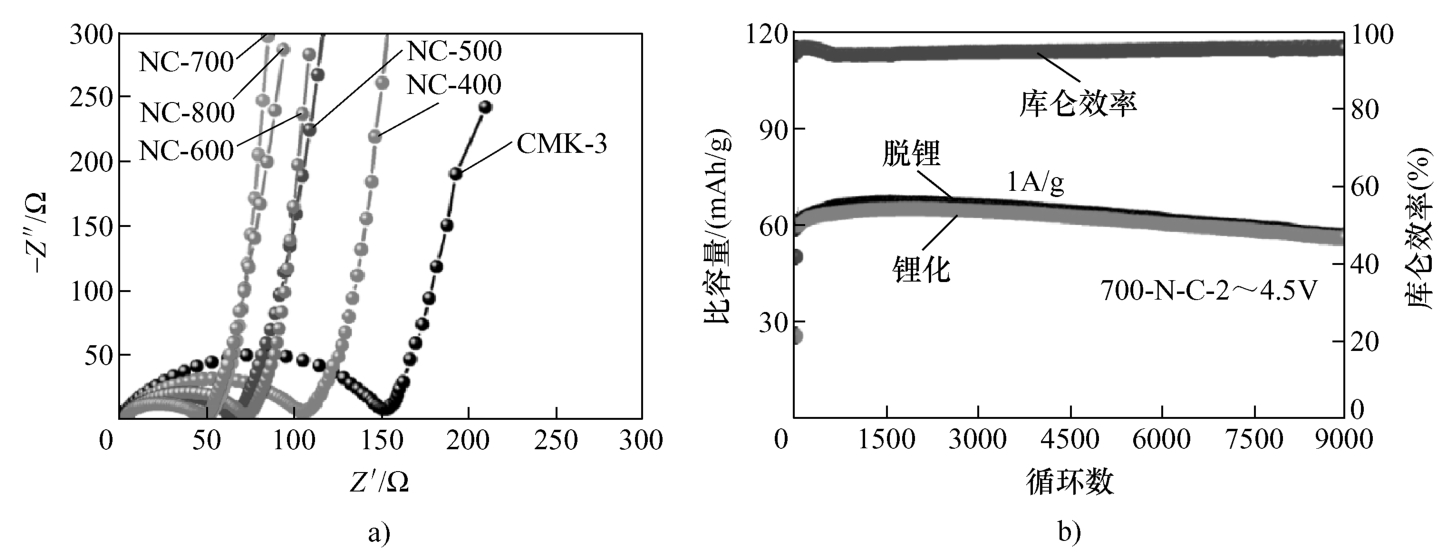 图3-23 a)CMK-3和NC-T的交流阻抗图;b)NC-700电极在1A/g时循环9000圈的长循环性能曲线
