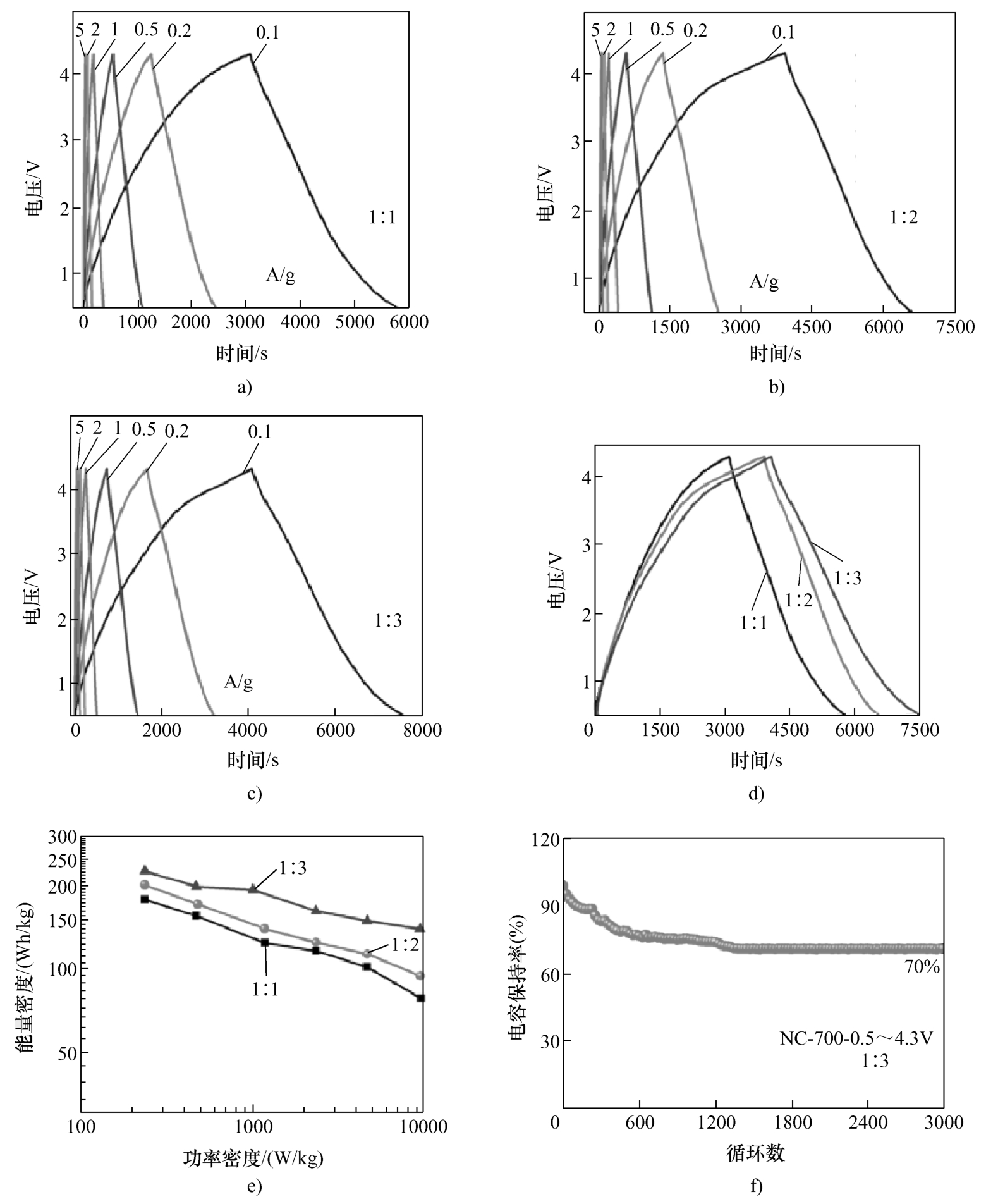 图3-28 NC-700//NC-700锂离子电容器正负极质量比为a)1:1,b)1:2和c)1:3时的恒流充放电曲线d)在0.1A/g的电流密度恒流充放电曲线对比;e)不同质量比(1:1、1:2和1:3)的锂离子电容器功率密度与相应的能量密度的关系谱图;f)质量比为1:3时锂离子电容器的循环性能图