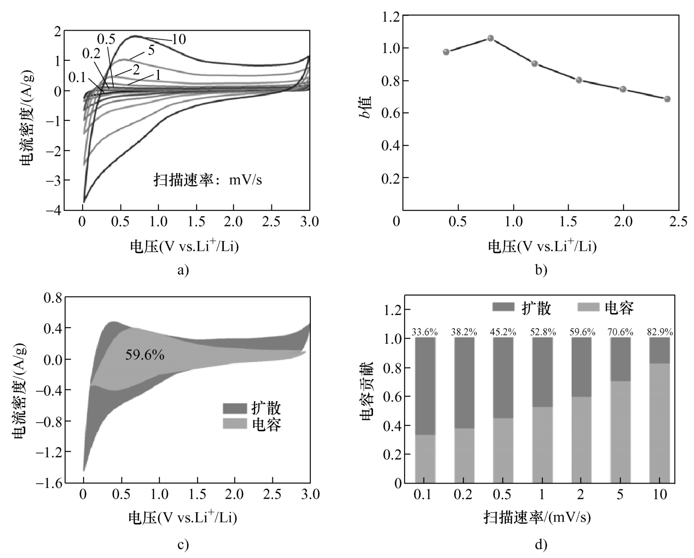 插层过程进行动力学分析。如图3-26a所示,一般来说,在特定电压处的电流贡献由电容部分和扩散控制部分组成,分别可表示为