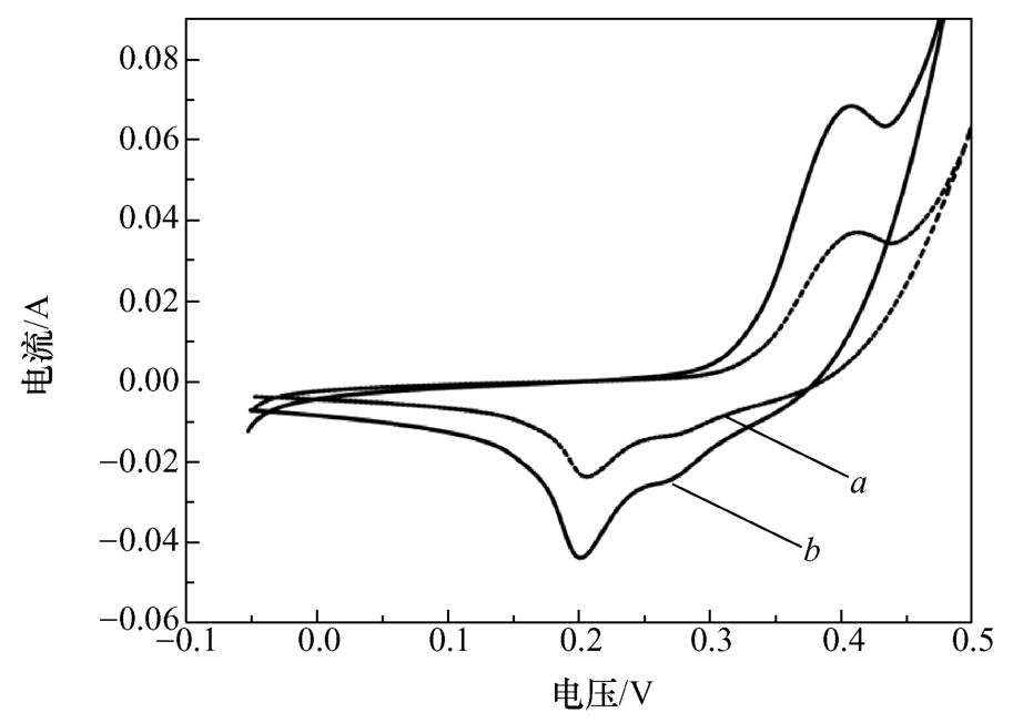 图2-4所示为氢氧化镍电极的循环伏安曲线( a =1mV/s; b =2mV/s)。测试条件是将氢氧化镍工作区间设置为-0.05~0.50V(与SCE相比),在3mol/L的KOH电解液中进行循环伏安测试。由图可知,循环伏安曲线没有呈现规则的矩形特征,存在明显的氧化还原峰,其中氧化峰对应于镍原子由Ni 2+ 氧化为Ni 3+ ,还原峰对应其逆过程。在0.20V和0.42V左右存在明显的氧化还原峰,表明此电位附近伴随有赝电容产生。经计算可得,在扫描速度为1mV/s和2mV/s时,最高比容量分别为1250F/g和1100F/g。