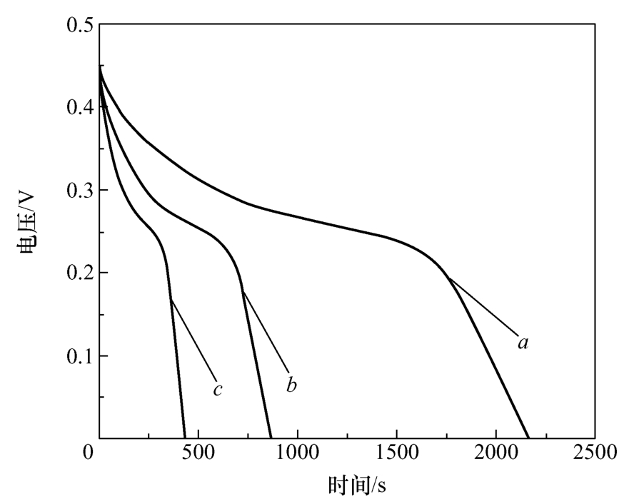 图2-5所示为氢氧化镍电极的恒流放电曲线( a =2mA; b =5mA; c =10mA)。经计算当放电电流为2mA、5mA和10mA时,比容量分别为1300F/g、1200F/g和1000F/g。由此可得,随着电流的增大,比容量变小。