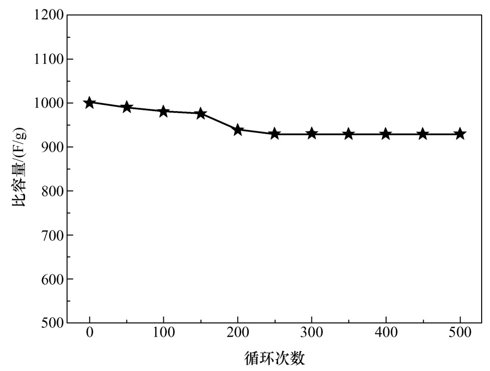 在10mA恒流电流条件下连续循环充放电若干次,氢氧化镍电极的循环性能如图2-6所示。由图可知,初次循环比容量高达1000F/g,达到200次循环后比容量稳定于930F/g(容量保持在93%以上),表明此材料具有良好的容量保持率。由于在充放电过程中电极材料发生了物质之间的传递以及重结晶导致电极材料纳米片的尺寸发生变化,从而增大了纳米片的尺寸以及减小了纳米片之间的间隙。