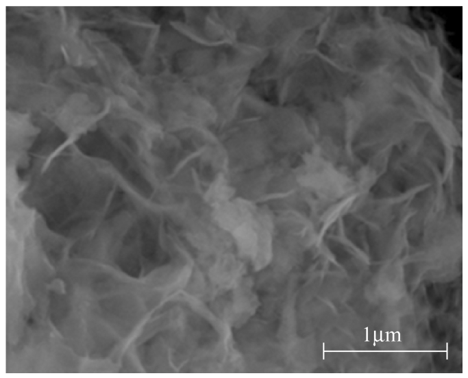 图2-3所示为氢氧化镍的扫描电镜图片。由图可知,Ni(OH) 2 是由薄片堆积而成的鳞片状形貌。此结构能够有利于电极与电解液的接触,提高了电极材料的比表面积,使其能够与电解液充分地浸润。