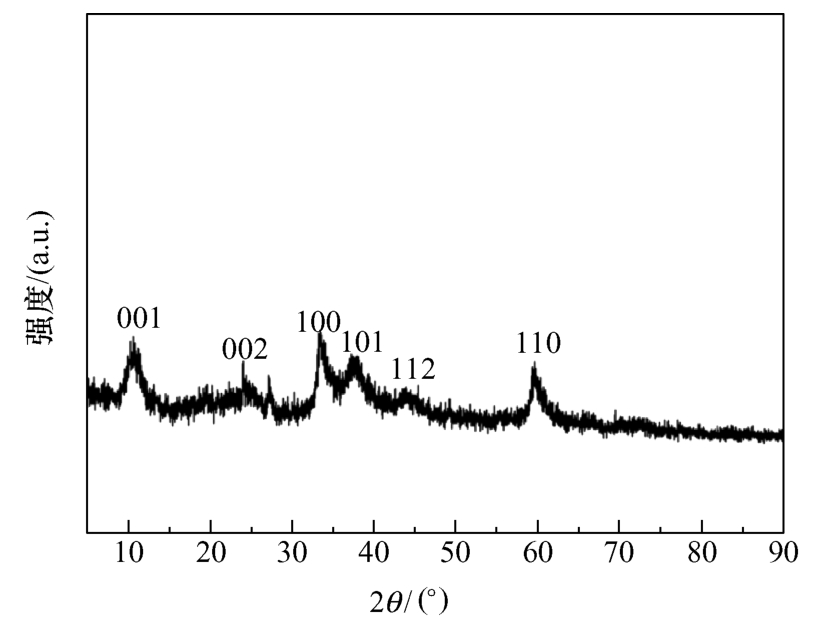 图2-2所示为氢氧化镍的XRD图谱。XRD图谱表明存在(001),(002),(100),(101),(112),(110)衍射峰。与标准谱图(JCPDS card 22-0752, a =0.3131nm, c =0.6898nm)相吻合,可确定样品为纯相的α-Ni(OH) 2 。