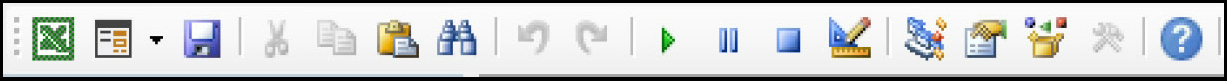 “标准”工具栏主要显示常用的功能按钮,包括视图(Microsoft Excel)、插入、保存、剪切、复制、粘贴、查找、撤销、重复、运行子过程/用户窗体、中断、重新设置、设计模式、工程资源管理器、属性窗口、对象浏览器等,如图1-15所示。