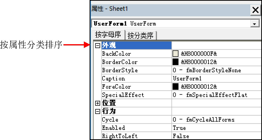 属性窗口用于查看或设置窗体及窗体组件的属性,如图1-19所示。在设置用户窗体时,会频繁地使用属性窗口。当选取了多个控件时,属性窗口会列出所有控件都具有的属性。