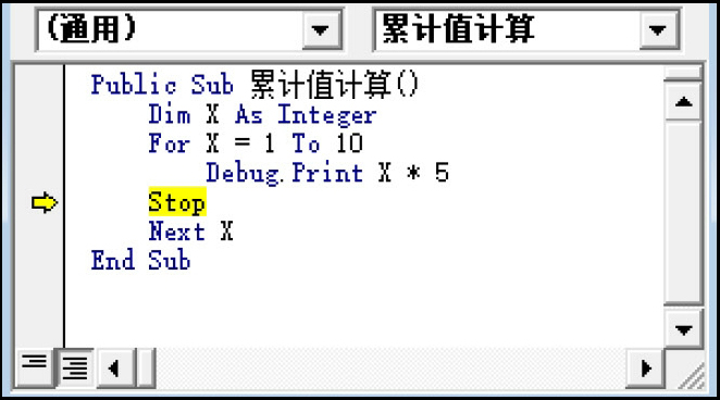 ● 逐过程:在代码编辑窗口中一次一个过程地执行代码。