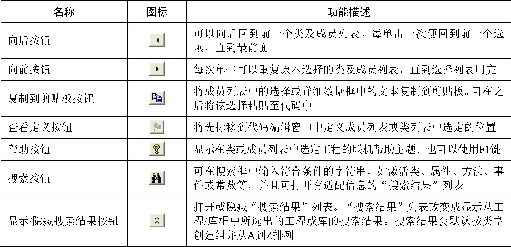 ● 详细数据框:显示成员定义。详细数据框包含一个跳转,可以跳到该元素所属的类或库。某些成员可跳到其上层类。例如,如果详细数据框中的文本提到Command1声明为命令按钮类型,单击命令按钮则可以到“命令按钮”类。可以将详细数据框中的文本“[;Win;>或拖动<]”复制到代码编辑窗口中。