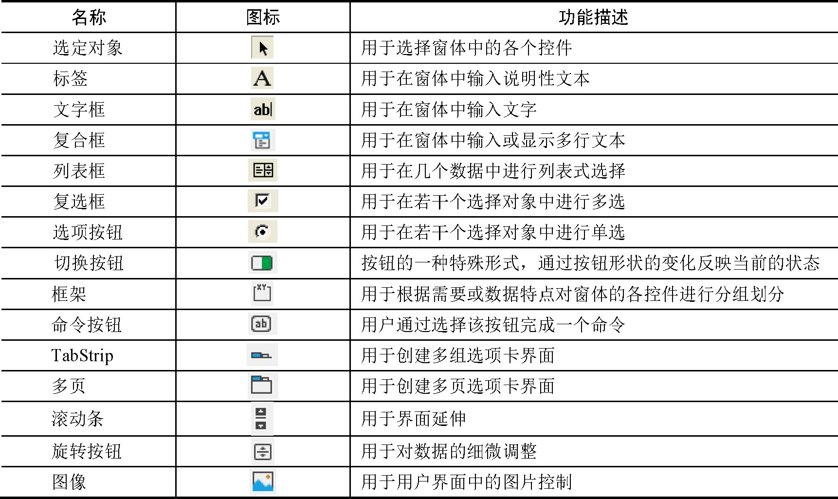 在“用户窗体”工具栏上显示的图标按钮从左至右依次说明如下: