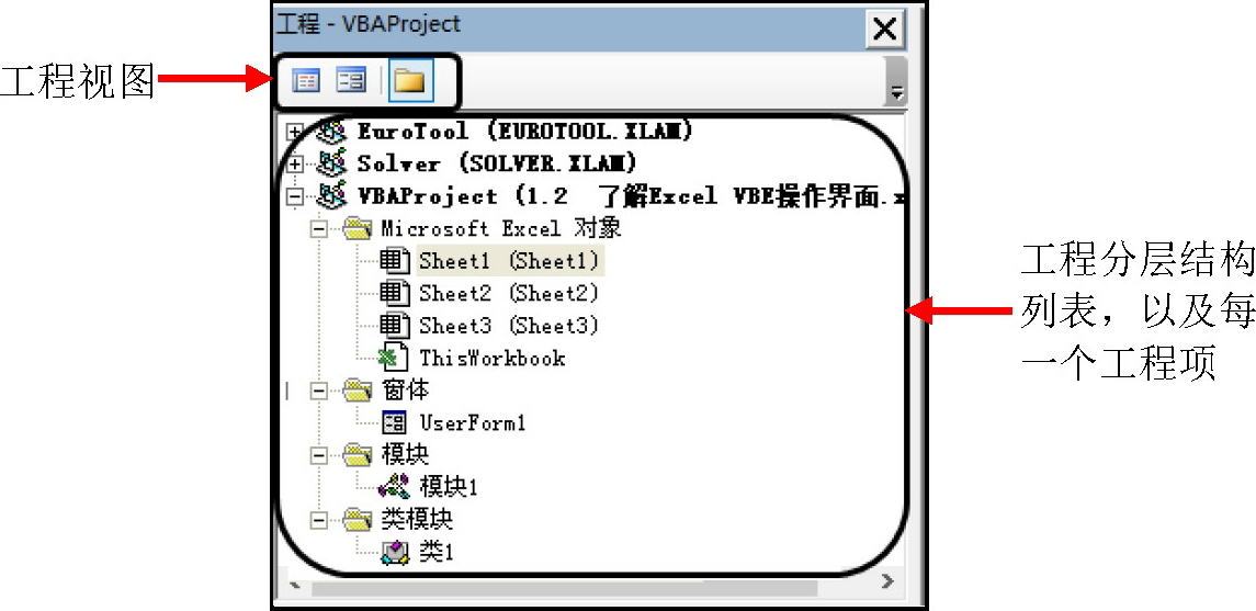 工程资源管理器用于显示所有工程的分层结构列表,以及工程中所包含并被工程引用的工程项(当前打开多少个工作簿就有多少个工程),如图1-18所示。