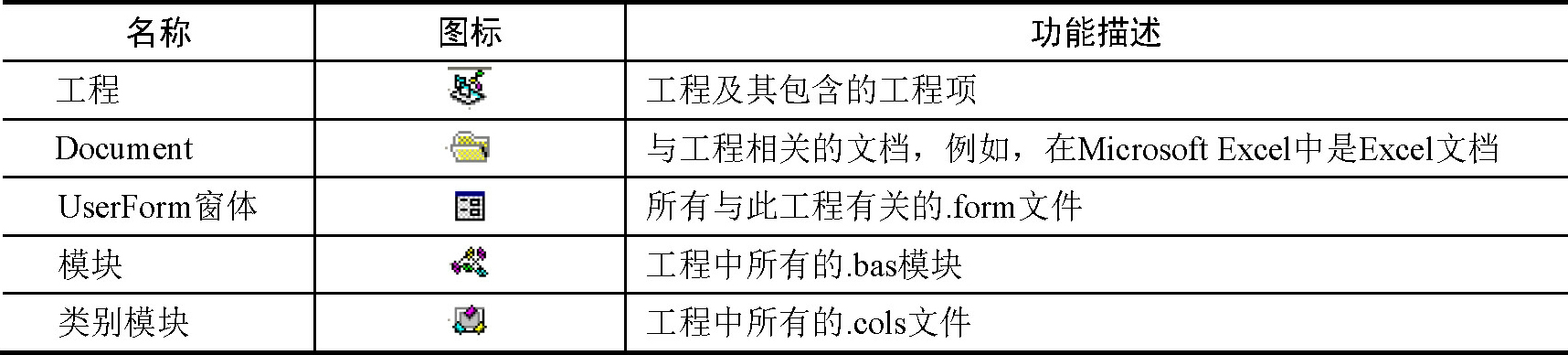 在工程分层结构列表中,显示了已装入的工程以及工程中的工程项。每一种工程都对应一个图标,这些图标及其功能描述如表1-2所示。