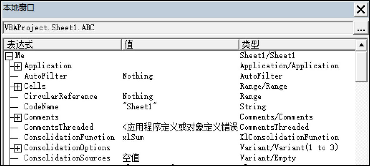 打开“本地窗口”,然后按F5键运行Sheet1中的代码,即可在“本地窗口”中显示出其中变量或对象的值,如图1-24所示。