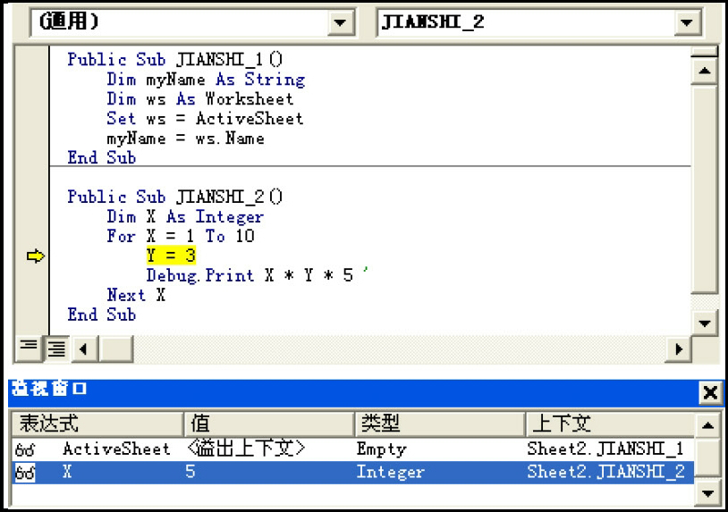 将光标置于第二段代码中,依次单击“调试→逐语句”菜单命令或者按F8键,迚入逐语句调试。图1-33所示是当循环计数器X=5时“监视窗口”的返回值。