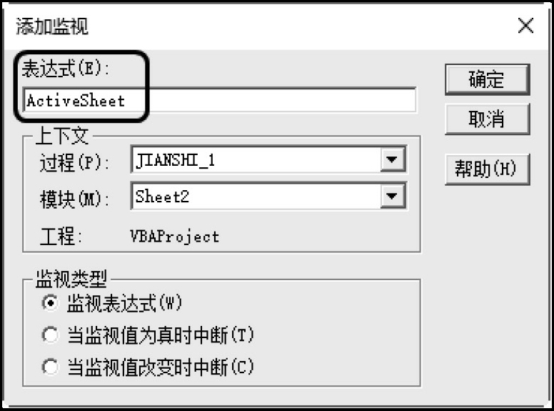 在“表达式”文本框中输入要监视的表达式“ActiveSheet”,选择监视表达式所在的过程和模块,然后选中“监视表达式”类型,如图1-30所示。