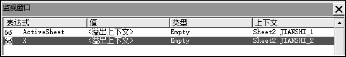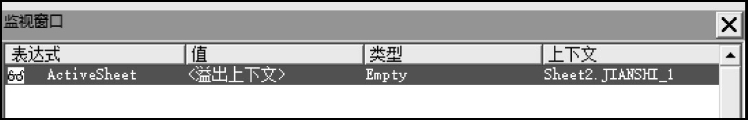 单击“确定”按钮,即可为程序添加一个监视表达式。此时可以在“监视窗口”中监视“ActiveSheet”对象的返回值变化,如图1-31所示。