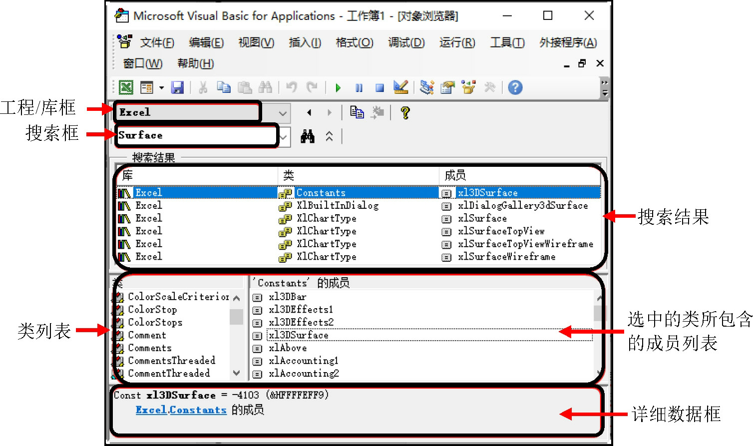 ● 对象浏览器:显示对象浏览器,列出在代码中会用到的对象库、类型库、类、方法、属性、事件、常数以及为工程定义的模块与过程。