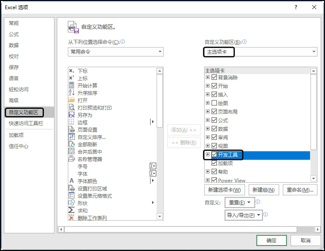 单击左侧的“自定义功能区”标签,然后在右侧的“主选项卡”列表框中选中“开发工具”复选框,如图1-3所示。