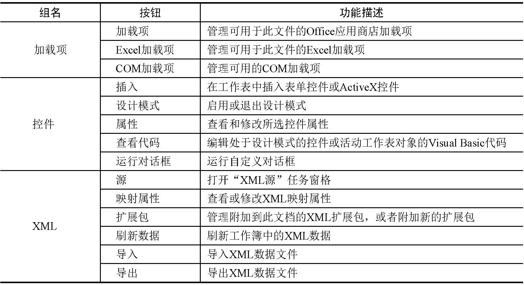 “开发工具”选项卡分成了4个选项组,分别是“代码”“加载项”“控件”和“XML”,具体描述如表1-1所示。