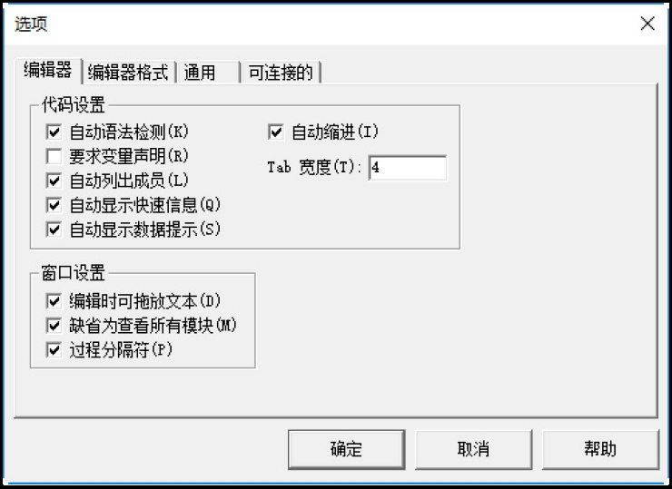 在已彔制了宏的工作簿中,按Alt+F11组合键打开VBA编辑器迚入VBA界面,然后单击“工具→选项”菜单命令,弹出如图1-8所示的“选项”对话框,可以看到各个选项卡下默认的选项情况。