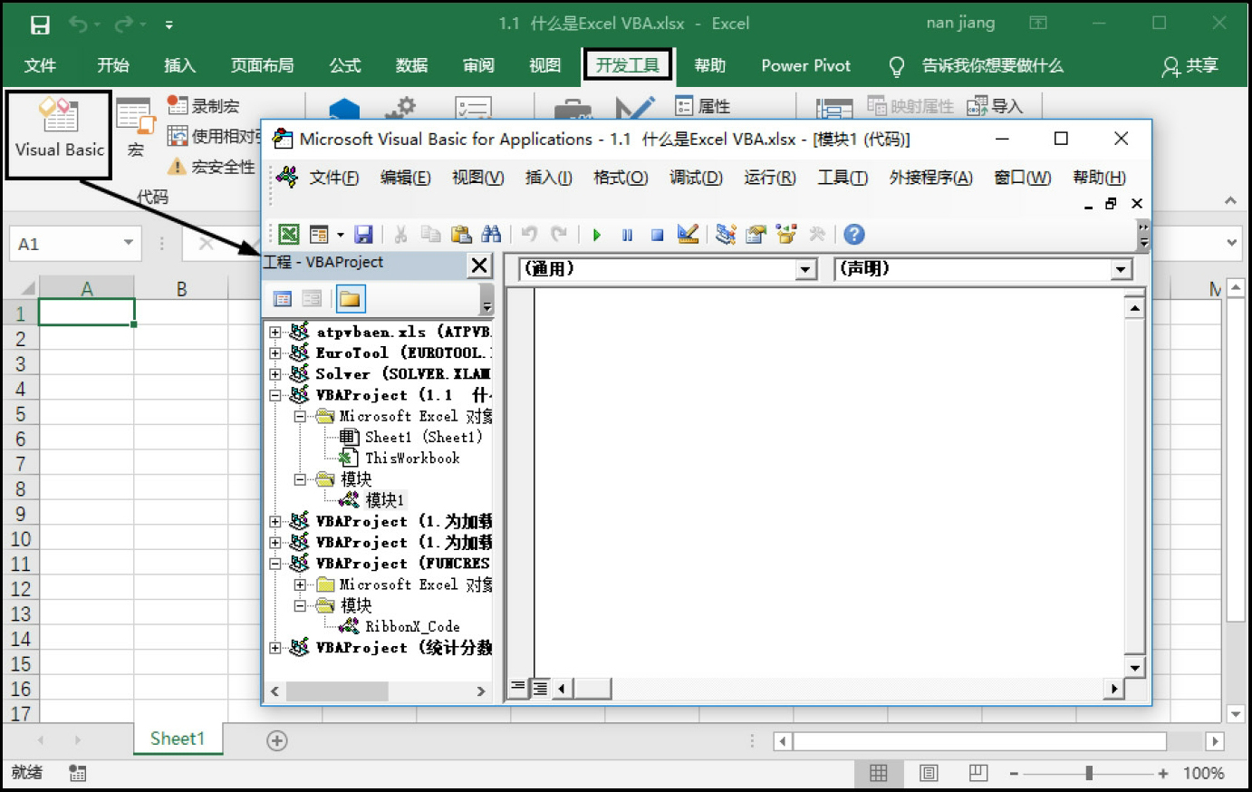 下面介绍如何打开代码编辑窗口,并向模块中放置VBA代码。