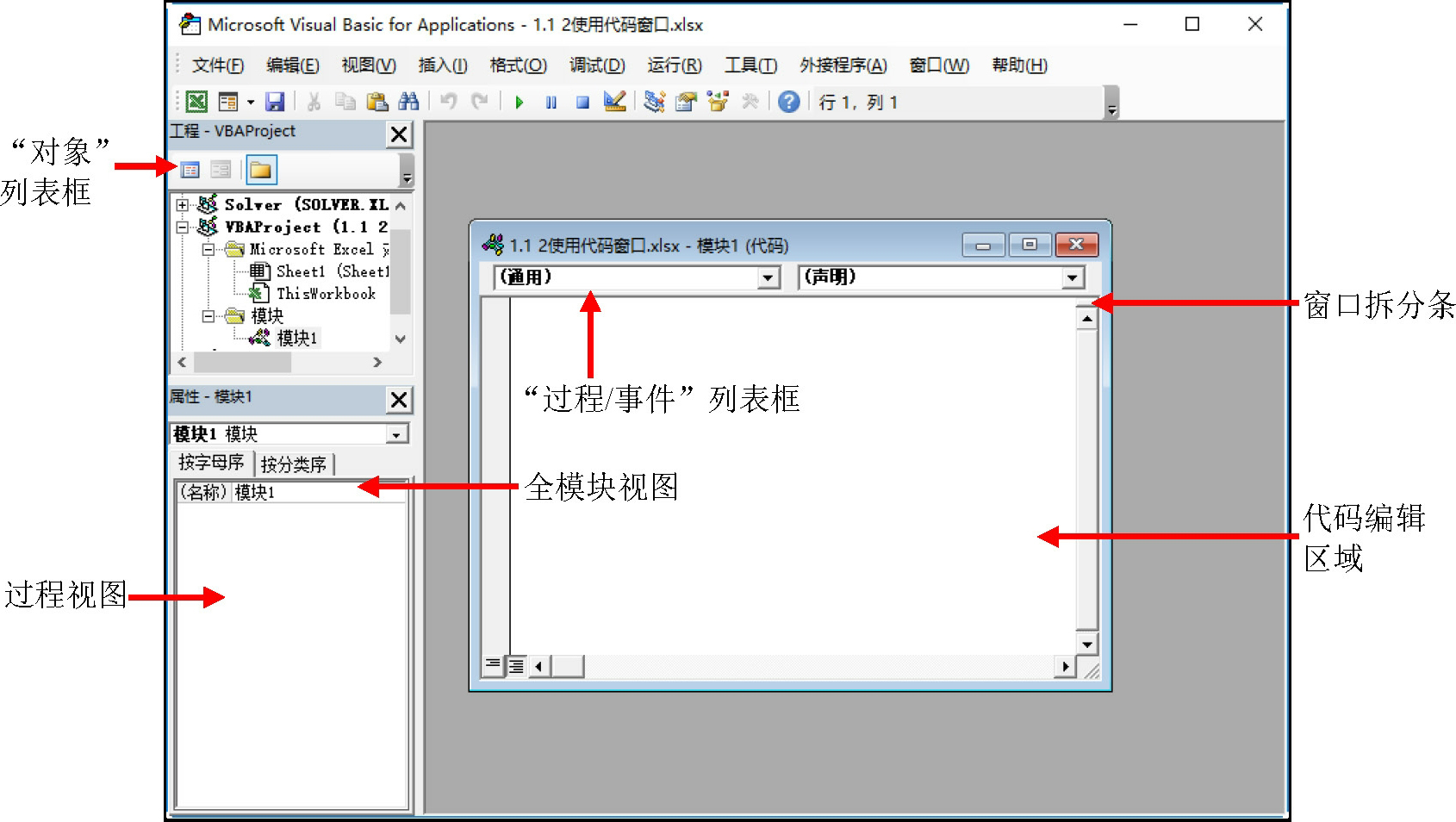 如图1-1所示是在Excel中运行VBA后的界面。本章会具体介绍该界面中的各项菜单命令及其属性,以帮助读者更好地学习VBA编程。