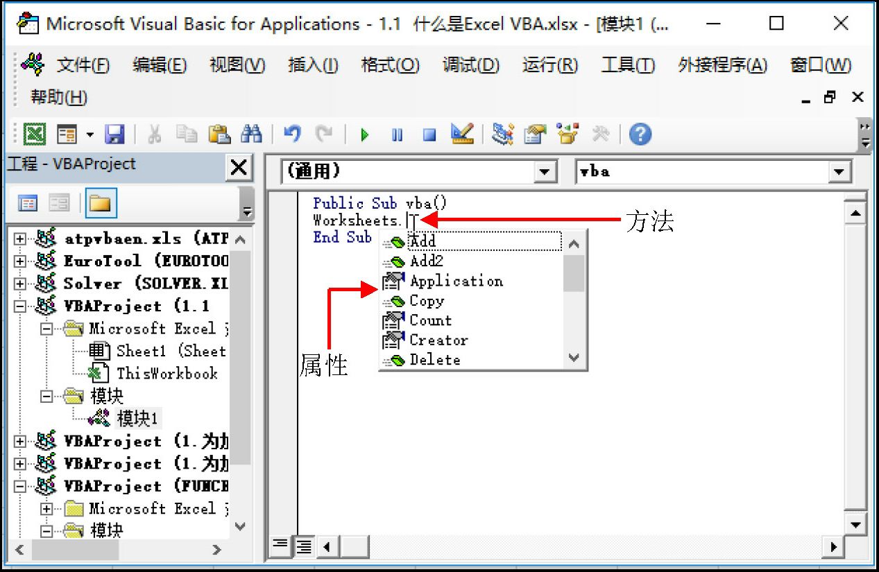 方法指的是对象能执行的操作,比如“Add”是属于工作表集合的一个方法,使用该方法能在指定的位置插入一个或多个工作表。方法实际上类似于一个VB过程,但这种过程是由系统根据可能的需求事先定义且封装好的,其内部代码不可见。也就是说方法是系统事先为对象定义的特定功能,它能有效简化用户的编程,但对象方法只能被调用,不能被修改,如图1-11所示。