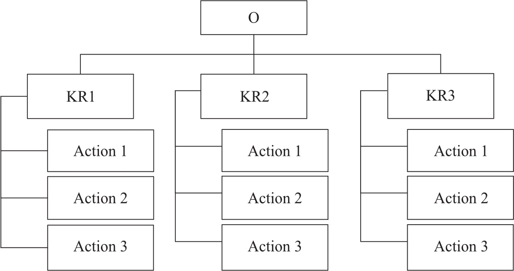 如图2-1所示,在OKR三层结构中,O是一种追求和方向,KR是通向这一追求的若干个里程碑,Action则是达成里程碑的一系列阶梯。