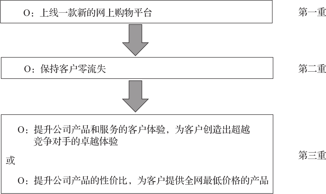 美国OKR专家巴特·邓·汉克在其辅导企业制定OKR的过程中,也经历过O的这一演进历程。 12 最初,汉克辅导的大型零售公司制定的O是“上线一款新的网上购物平台”。然后,当他们试图定义这个O的KR时,发现它们只能是一些诸如什么时间完成设计、什么时间完成开发之类的项目里程碑,这显然太过常规,没有任何激励人心的成分。在汉克驱车回家的路上,他突然顿悟:上线一款新的网上购物平台,只不过是达成目标的一种方式,而不应该是目标本身。当初为什么要定这个目标呢?因为公司发现,现有的在线购物平台上的客户正在加速流失,希望能通过开发新的线上购物平台拉回一部分客户。但是,开发新的线上购物平台,能否阻止现有在线购物平台上的客户流失呢?很显然不能。新的线上购物平台能否带来更多的客户呢?答案也是不确定的,因为公司并没有深刻分析现有客户流失的原因。如果从这个层面考虑,公司真正的目标应当是阻止客户流失,而非再造新的线上购物平台。于是,汉克帮助公司重新定义了O:保持客户零流失。在这个目标之下,是否还要发布新的在线购物平台,就需要再讨论了。在我看来,这两个版本的O代表着O的三重境界中的第一重和第二重,汉克如果继续深挖,很可能会发现:保持客户零流失这一目标,还可以再进一步演进。保持客户零流失是站在公司角度思考的结果,如果站在客户角度去思考,客户为什么会流失,公司给客户创造了什么新的价值从而留住客户,这些问题都没有被探讨。如果我们站在客户角度来思考,公司的O可能是下面这样。