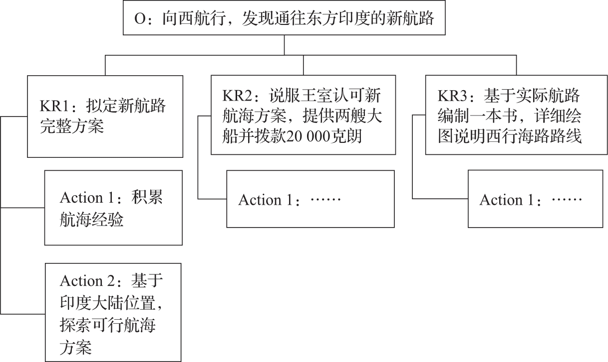 以哥伦布发现新大陆为例。如果哥伦布要定一个OKR,他会怎么来定呢?在哥伦布之前,从西方通往东方一共有两条路线:一条是陆路,由中亚沿里海、黑海到达小亚细亚,这条线路被当时的奥斯曼帝国垄断;另一条是海路,途经非洲的好望角到达印度,这条路线被葡萄牙把持。因此,当时哥伦布希望能开辟一条新的海上通路。哥伦布凭借自己丰富的航海经验,提出了一个大胆的设想:向西航行。用OKR语言表达,哥伦布的O就是“向西航行,发现通往东方印度的新航路”。在哥伦布时代,没有经纬度地图,哥伦布不知道印度准确的经度和纬度是多少,只知道地球是圆的,印度在地球的东方。为了实现找到新航路这一目标,哥伦布做了大量的准备。他首先拟定了一个通往新大陆的方案,并不断完善这一方案。之后,他花了大量的时间去说服西班牙王室,希望王室能提供两艘大船并拨一笔专项款以资路费。在这些准备工作就绪之后,他就可以正式启航去探索新大陆了。哥伦布打算在航海过程中“绘制海图,标注海洋水域和陆地方位的确切情况,进而打算编制一本书,用绘图说明赤道两边纬度和西行经度的整体情况” 10 。同时,“哥伦布在这次值得纪念的航海扬帆起航之日,就开始定期写日志,以备西班牙君王检查” 11 。所以,如果用OKR语言表达,哥伦布的OKR如图2-2所示。