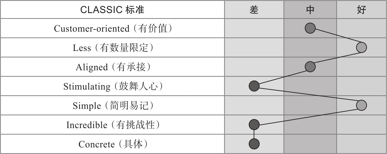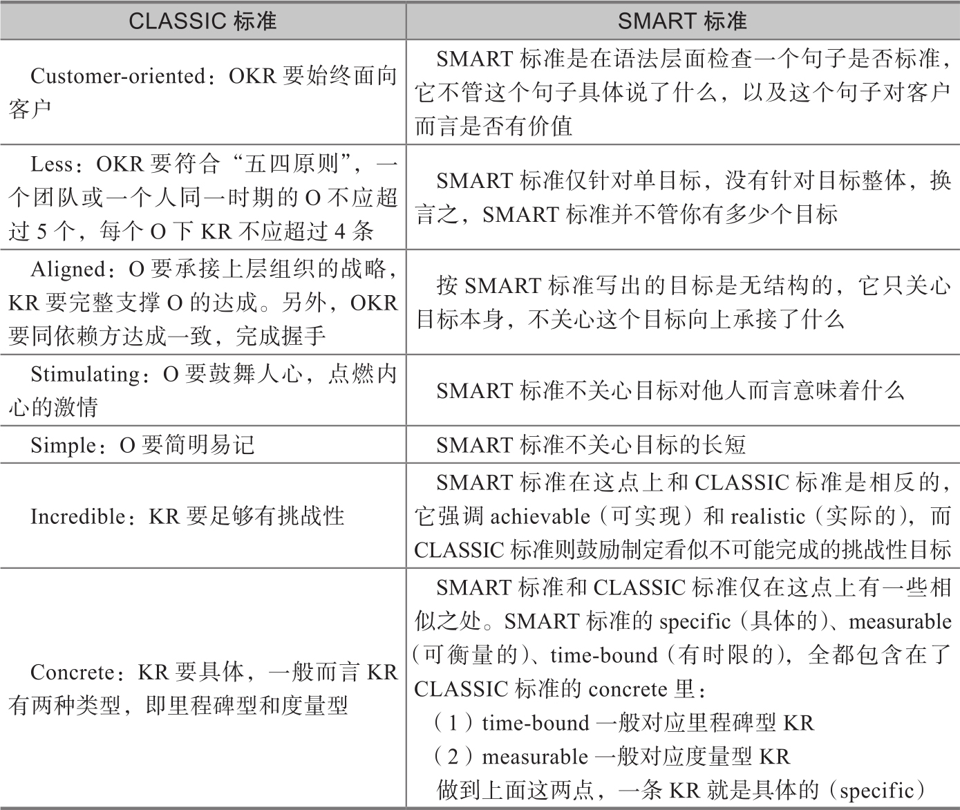 退一万步,即便SMART标准适合用来衡量无结构的KPI,它也依然不适合用来衡量OKR,因为OKR是有结构的。OKR的O和KR组成了两层结构,O指明方向,KR明确具体要达成的结果,KR要围绕O去构建,O和KR是存在差异的。这也就是说,在评估高质量OKR的标准中,应当分别定义O和KR的标准,这样才更具有指导意义。基于过去在企业大量的OKR实践,我发现,好的OKR更符合CLASSIC标准,而非SMART标准。CLASSIC七个字母分别代表制定OKR时应关注的七个方面,其具体含义如下。