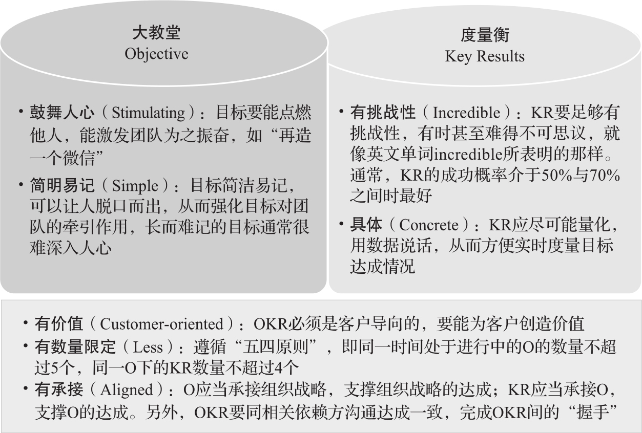 ◘ 鼓舞人心(stimulating): O应当具有很强的感染力,能够激发团队或自己为之奋斗。例如,“再造一个微信,满足企业客户的安全沟通需求”就是一个非常鼓舞人心的O。大家都知道微信非常成功,截至2021年9月30日,微信产品合并月度活跃用户数达到12.6亿, 17 是公认的国民级即时通信软件,能再缔造一个微信级软件,那无疑是非常令人兴奋的事。