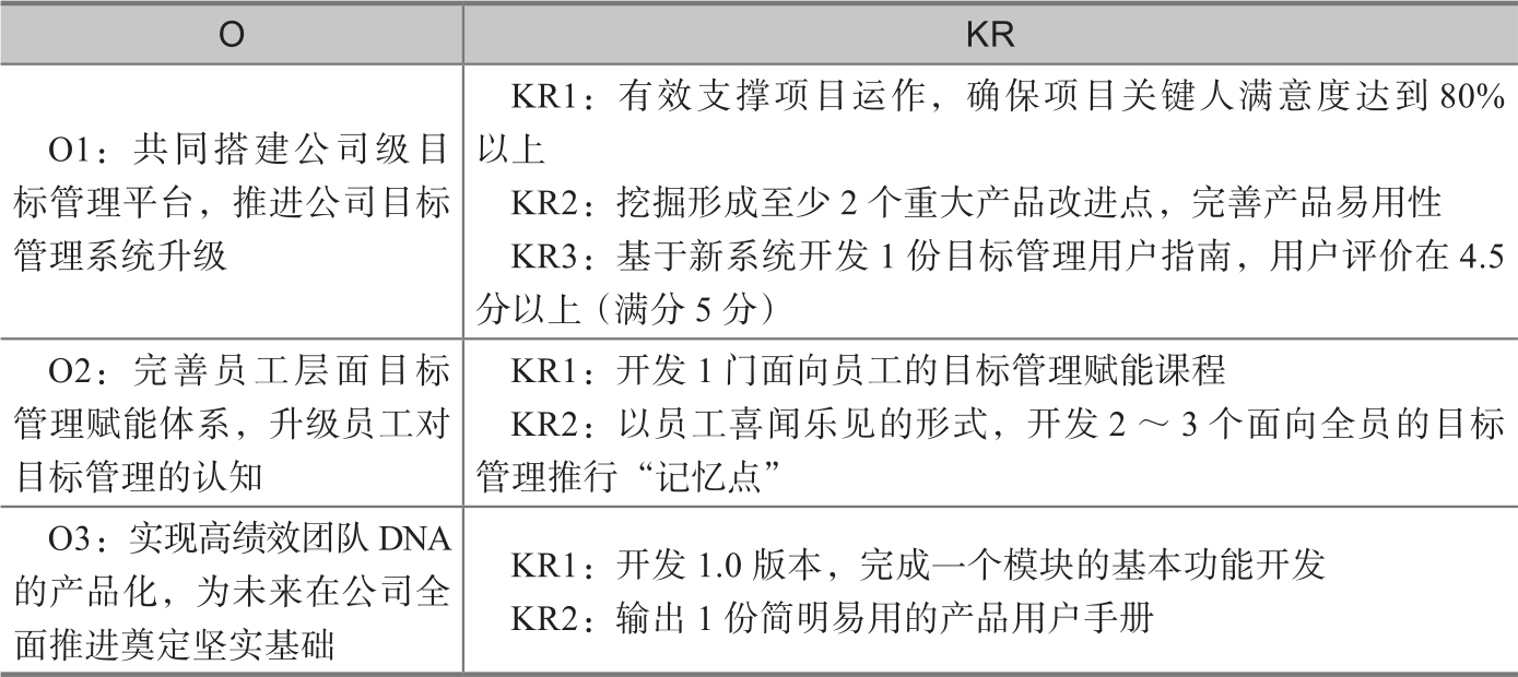 下面我们来看一些例子。例如,某电商企业客户服务部下的产品开发部制定了一个下面这样的OKR。