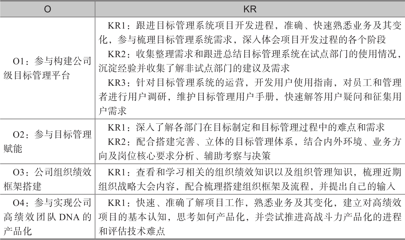 再举一个我的团队中的例子。我的团队中新来了一个小田同学,他制定了如表2-2所示的4个OKR。