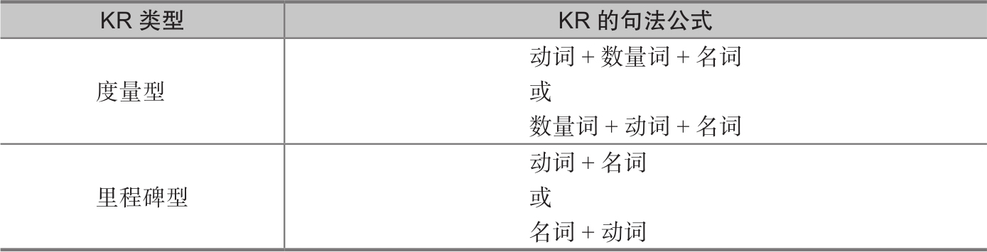 需要说明的是,OKR的句法公式为你写出好的O和KR提供了一个模板,但请不要刻板地把它当成数学公式一样去机械套用。OKR的句法公式就像你的学步车,在你的OKR学步阶段,它是你的好帮手,一旦你掌握了制定OKR的要领和精髓,你大可甩开它,健步如飞。
