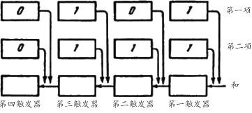 假设有三条触发器链,它们像图3所示的那样连接,最上面的一排触发器用来记录第一个加数,第二排触发器用来记录另一个加数,最下面的一排表示算出的结果。装置启动时,第一排和第二排的触发器中处在状态1的触发器会把脉冲传给第三排的触发器。