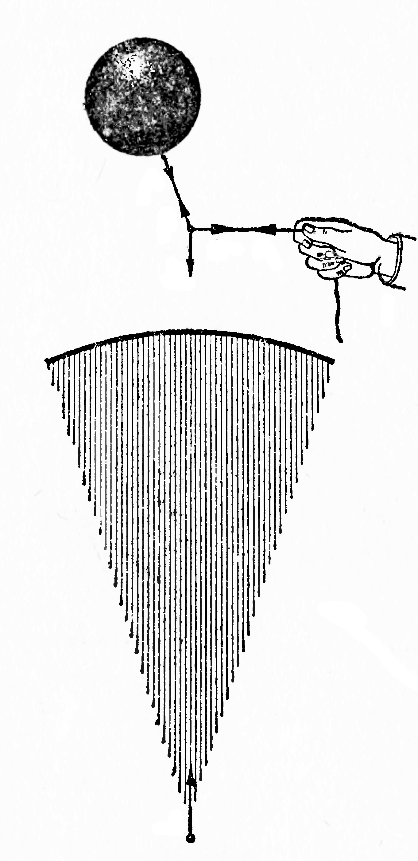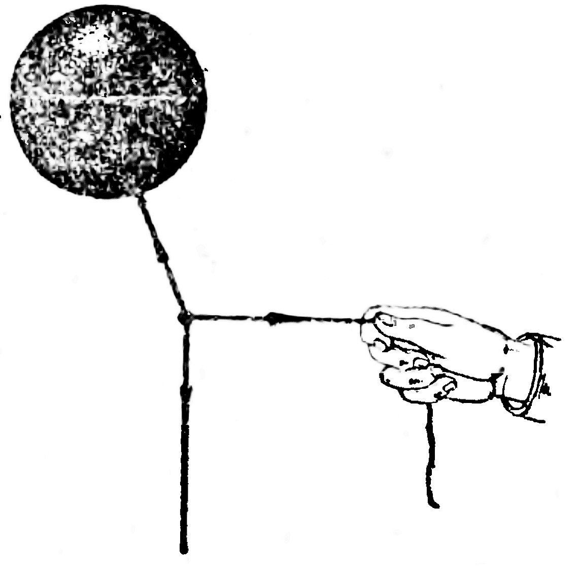 现在,我们研究作用于氢气球坠儿上的三个力P、Q、R(图5)三者分别代表氢气球的牵引力、绳子的牵引力和坠儿的牵引力。表面上,这三个力相互之间是独立的,但事实上三个力均具备与其自身相等,但是方向相反的反作用力。详细说,与力P相反的作用力作用于氢气球的绳子上,并通过绳子传到氢气球上(图6的力P 1 )。与力Q相反的作用力作用在人的手上(图6的力Q 1 ),与力R相反的作用力作用于地球上(图6的力R 1 ),因为坠儿在受到地球引力影响的同时也吸引着地球。