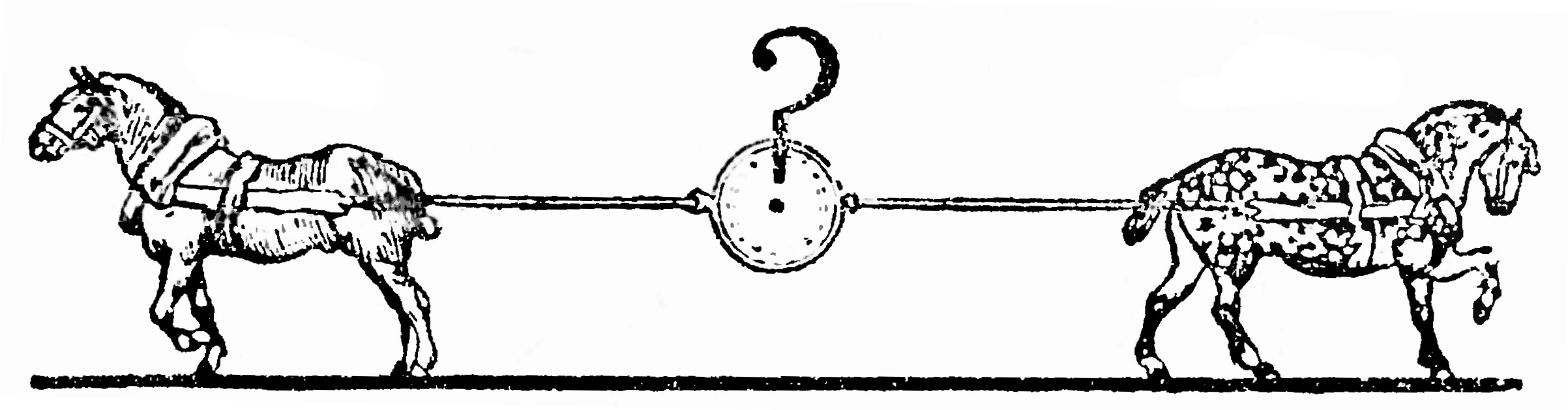 由于这个道理,当马德堡半球分别由8匹马在两边向相反的方向拉,我们不能认为,马德堡半球受到了16匹马的拉力作用,如果没有相反方向的8匹马,另外8匹马便不会对半球产生影响。其实,一堵坚固的墙便可以代替其中一方的8匹马。