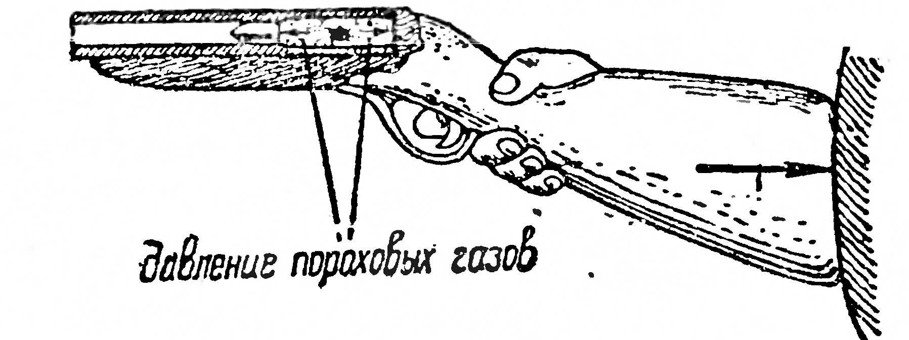 现在我们对枪的反冲力进行研究,作为前面力学公式参考一览表的一个例子。枪内的火药的气压将子弹推向一个方向,同时也向相反的方向推枪,出现我们熟悉的“反冲力”现象。那么,枪在反冲力的作用下运动速度是多大呢?让我们重复一下作用力与反作用力相平衡的定律。依据这个定律,火药的气压作用于枪体,会与加在子弹上的压力相等,两个力的作用时间也相同。从力学公式中可以看到,力F和时间t相乘等于“动量”mv,即等于质量m与物体的速度v相乘:Ft=mv。