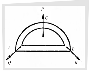 我们不难指出发明家错在哪里。他在设计时没有注意到,不仅在液体流动路径的弧线ACB部分可以产生离心力,在液体流动转弯的地方A、B两点之间时也能产生离心力(图14)。虽然这两个曲径并不太长,但转弯却转得很急(曲率半径很小)。而我们知道,转弯越急(曲率半径越小)离心力就越大。因此,在转弯的地方还应有两个向外作用的力Q和R,这两个力的合力向下作用,与力P实现均衡,而发明家把这两个力漏掉了。其实,如果他知道重心移动定律的话,即使他疏漏了这两个力,他也会明白自己的设计根本是不合理的。