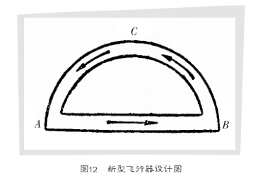下面我们列举一个可以令人受到启发的例子,是关于一种全新形式的飞行器的设计。这个例子说明,如果忽视重心移动定律,发明家会误入怎样的歧途。发明家表示:“假设有一个闭合的由两部分组成的管子(图12),它的水平直线部分为AB,它上边的弧线部分为ACB,在管子里有一种液体不间断地沿着一个方向流动(装在管子里的螺旋桨对它进行推动)。液体在管子弧线部分ACB内流动的时候会产生压向管子外壁的离心力。于是就产生一个方向向上的力P(图13),它不会受到任何反方向力的作用,因为液体在直线形管子AB里的流动没有产生离心力。”发明家由此得出结论:当水流速度足够大时,力量P应该能使整个装置向上抬起。