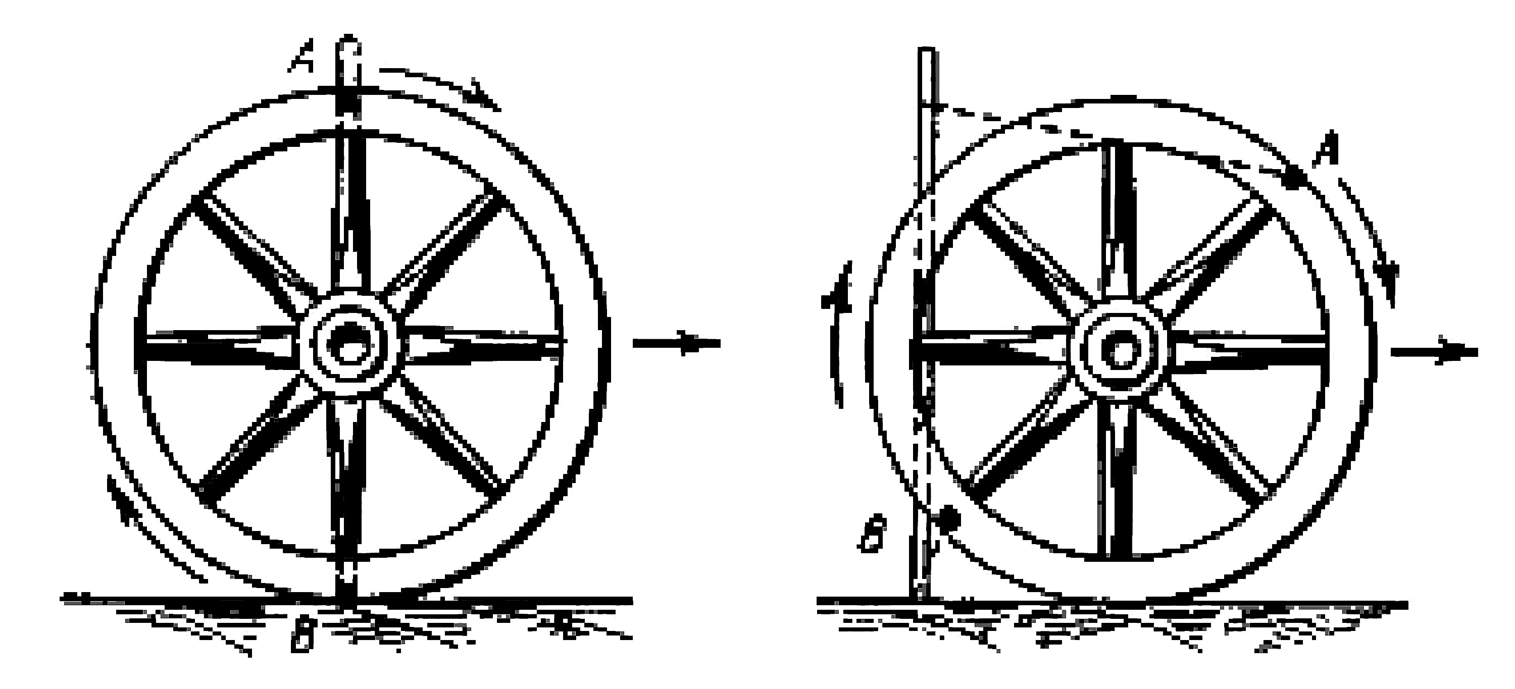 图7 比较一下滚动后车轮上的标记点A和B与未移动的木棒之间的距离(右图),我们就可以证明,的确车轮的上半部要比车轮下半部运动得更快些