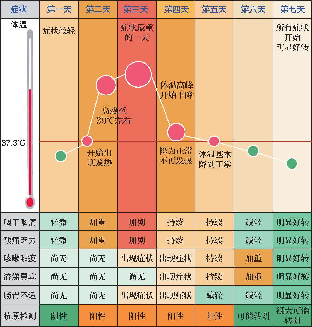 感染奥密克戎后的症状存在个体差异,典型的感染者病程通常为 7天左右,发热一般不超过 3天,早期主要表现为咽干咽痛、咳嗽、发热等症状。一般第4天症状逐渐好转,第 6~7天开始出现抗原检测结果转阴。