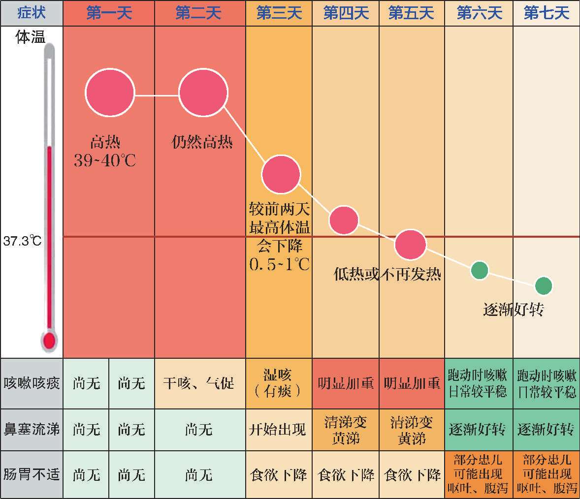 儿童患者潜伏期更短,一般感染后更短时间内就会出现发热症状, 婴幼儿体温可能高达39~40℃,需要警惕热性惊厥。 儿童患者 第3天开始出现体温下降 ,间断发热,并出现鼻塞、流涕、咳嗽等症状,经过对症治疗, 第6~7天逐渐好转。