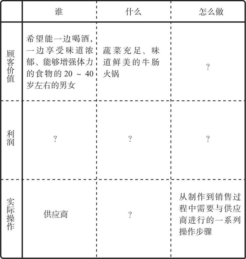 A先生估算的单份火锅成本价约为400日元,因此销售价格应为每份1350日元左右。但这样一来,A先生就很难凭借价格优势在已经进入市场并渗透到当地的牛肠火锅店中占据一席之地。A先生希望尽可能以低价格提供牛肠火锅,但他对这种做法是否能够盈利并没有信心。