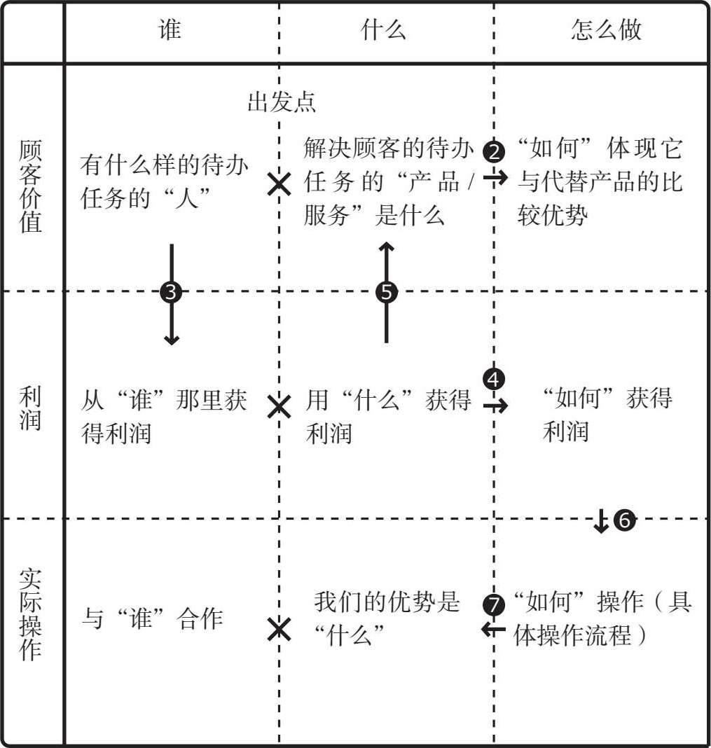 根据以上步骤,完成了顾客价值与利润的组合后,我们就要将目光转移到实际操作中去了(箭头❻)。