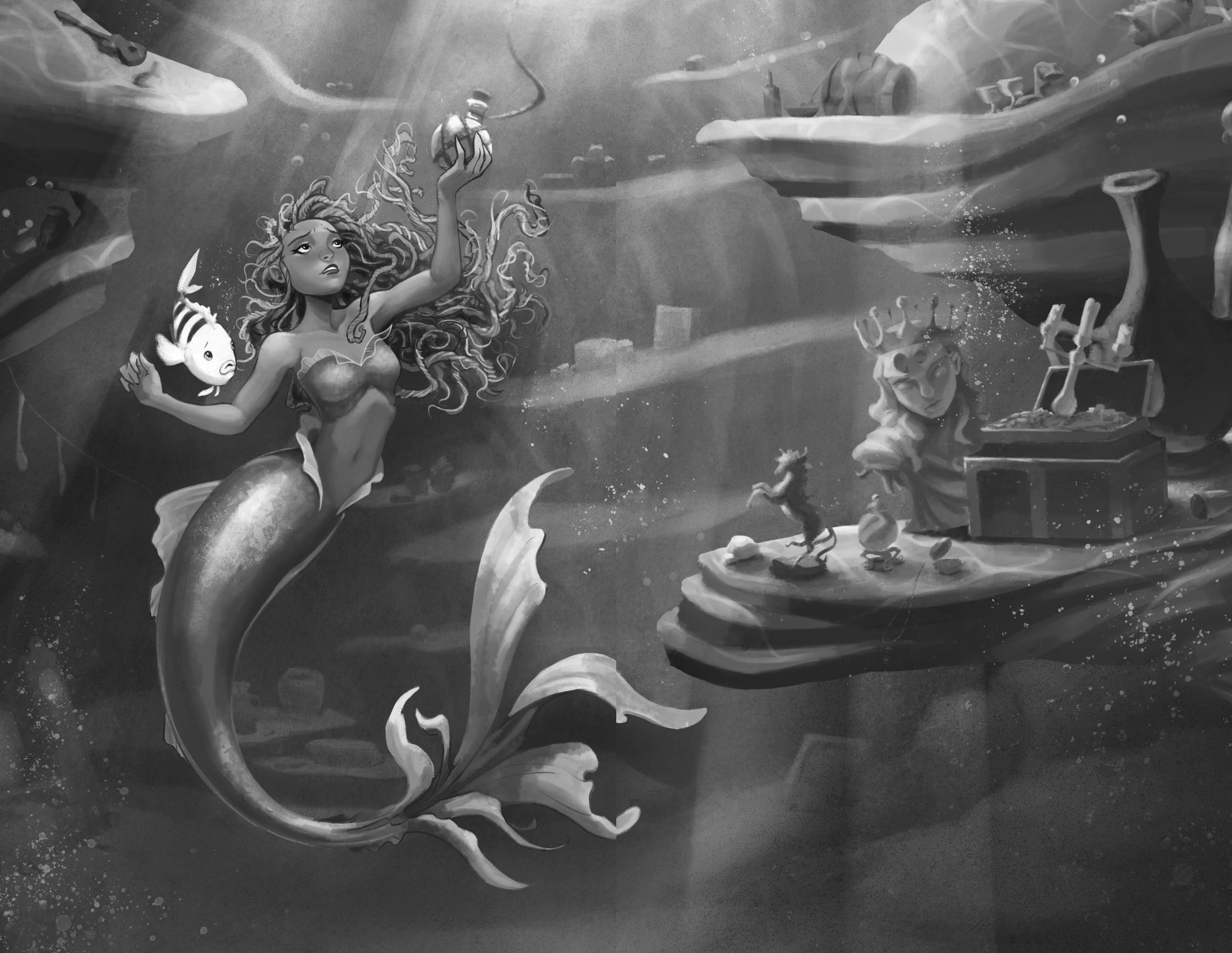 Ariel can barely see straight as she flees from the throne room.Her body moves of its own accord,leading her to the place that has become a refuge whenever she’s feeling troubled: her hidden underwater grotto.