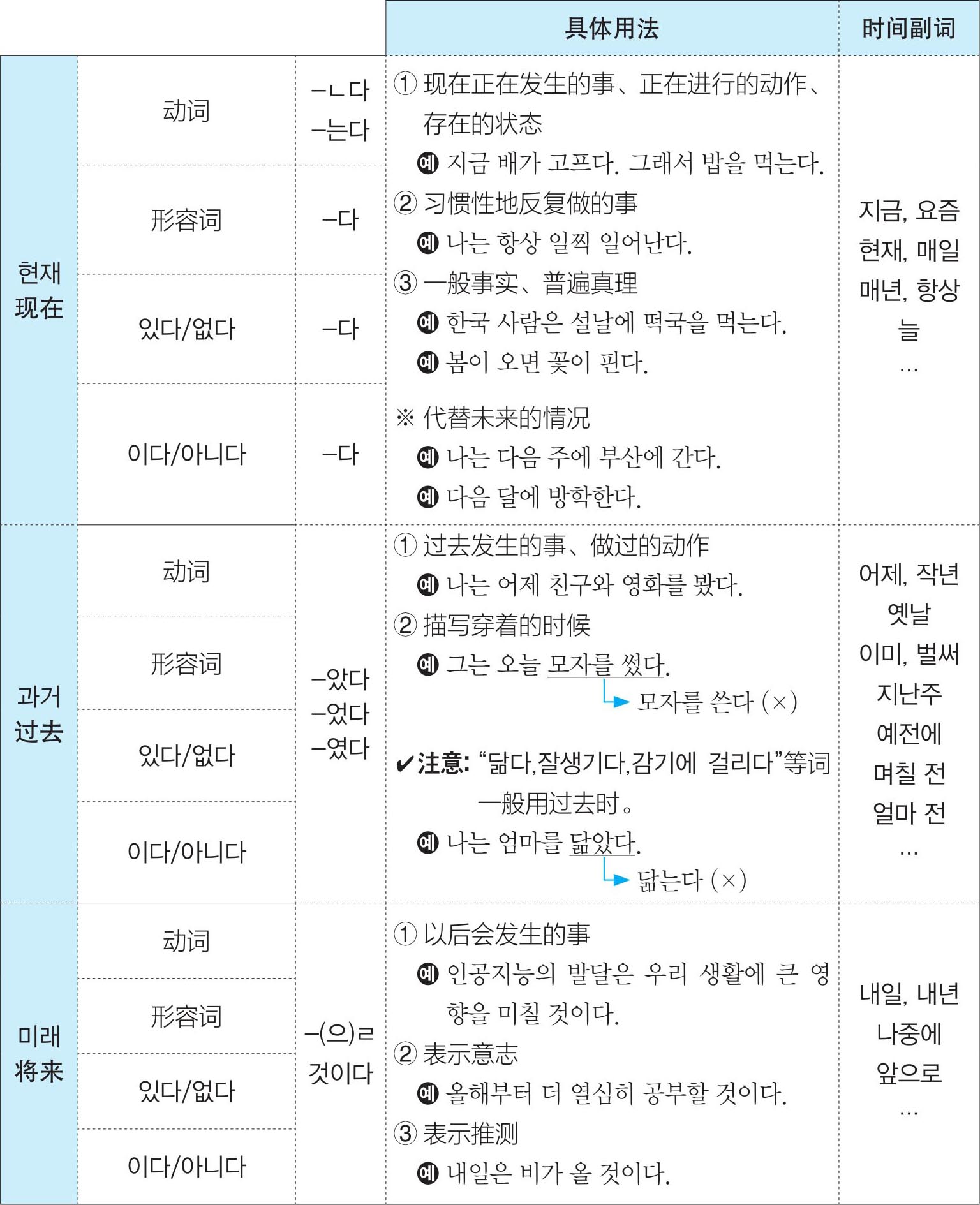 韩语的时态大体上可以分为“过去-现在-将来”。时态可以以正在说话的时间为基准,也可以以句子中其他事情发生的时间为基准来体现。在谓语后面加上“-ㄴ/는,-았/었/였-,-(으)ㄹ”是韩语的时间表达方式之一。