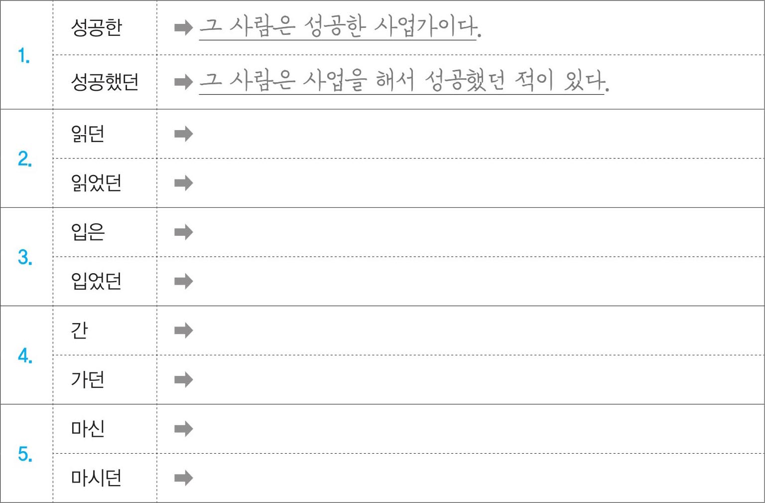 여러분은 학창시절을 떠올리면 무엇이 생각납니까? ‘-(으)ㄴ’,‘-던’,‘-았/었/였던’을 사용해서 문장을 완성해 보세요.